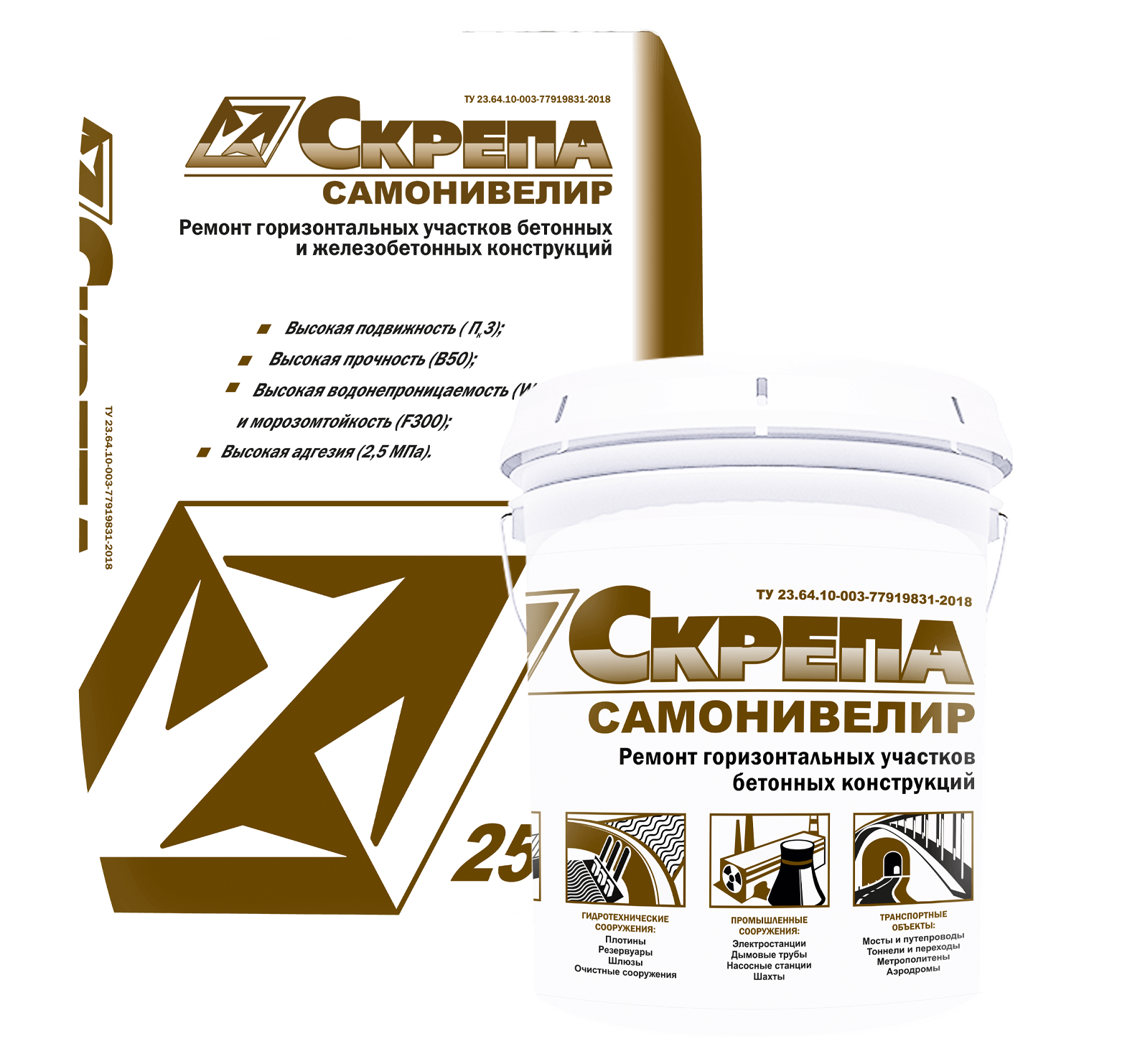 Смесь сухая ремонтная, поверхностно-восстановительная Пк3, B50, W18, F300 "Скрепа Самонивелир" ГОСТ 31357-2007. Состоит из портландцемента, кварцевого песка определенной гранулометрии, химических добавок и армирующего фиброволокна.